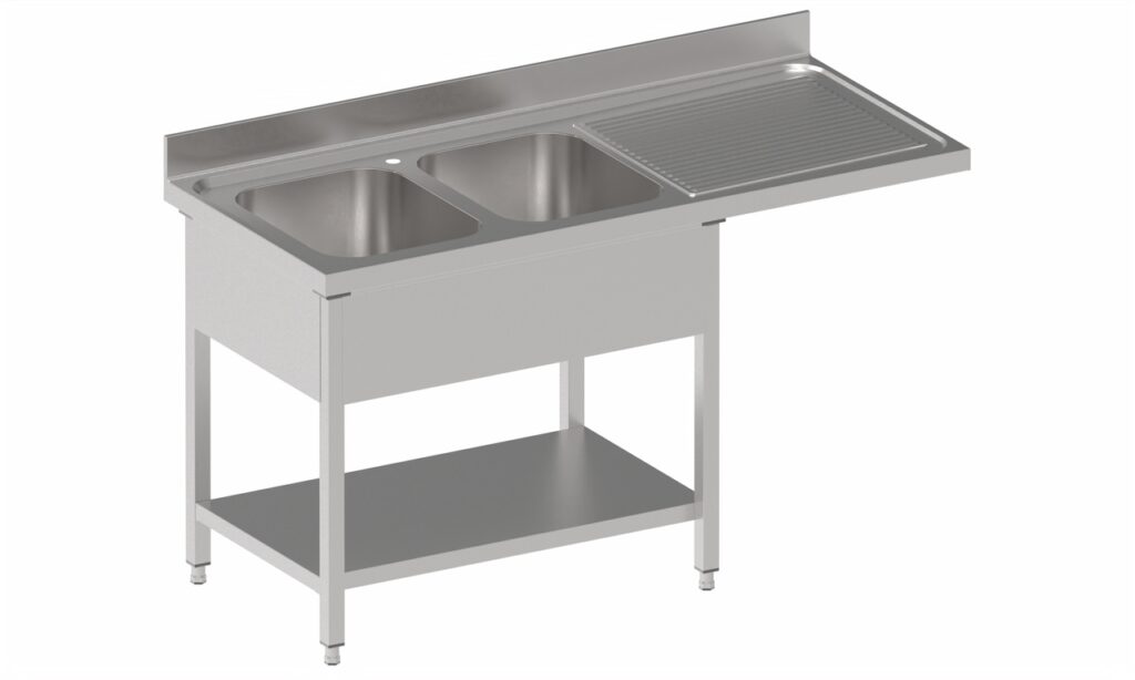 Die Spülenstruktur ist mit Omega-Profilen aus 1 mm starkem Edelstahlblech AISI 304 verstärkt, was außergewöhnliche Stabilität und Langlebigkeit garantiert. Der Spülenunterbau kann je nach Platzbedarf mit oder ohne Zwischenboden geliefert werden. Der Zwischenboden besteht aus 0,8 mm starkem Edelstahlblech und ist mit Omega-Profilen verstärkt, was zusätzliche Festigkeit und Stabilität gewährleistet.