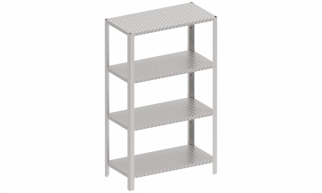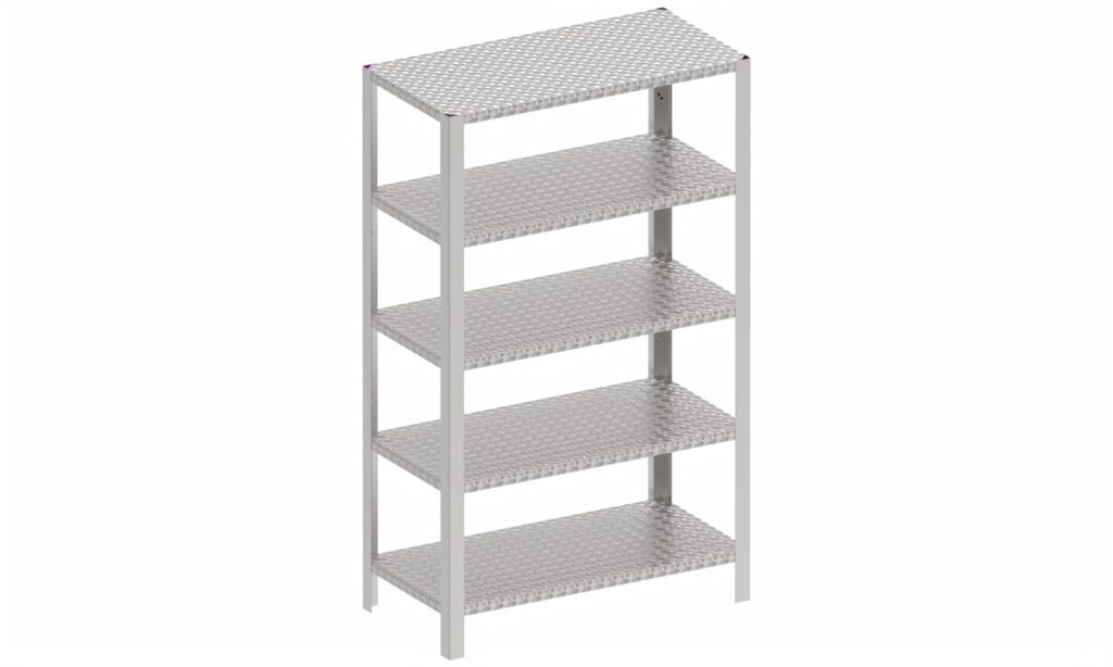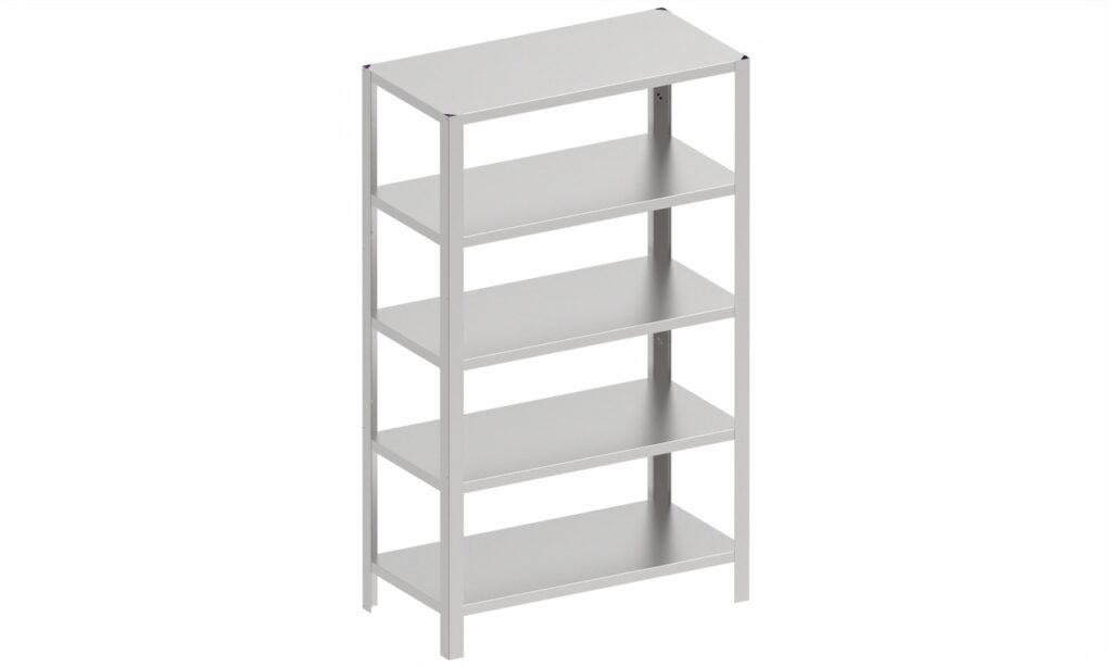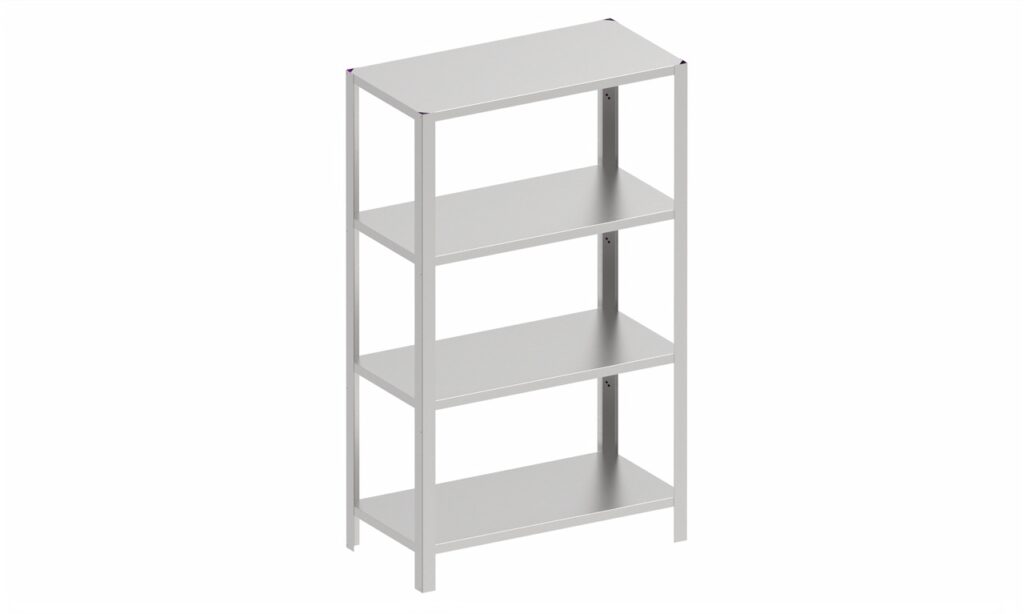 Polica od nehrđajućeg čelika s 4 ili 5 razina, izrađena od lima od nehrđajućeg čelika debljine 0,8 mm s ojačanjem od lima od nehrđajućeg čelika debljine 1,5 mm. Nosači polica izrađeni su od lima od nehrđajućeg čelika debljine 1,5 mm, a polica se sastavlja pomoću vijaka, što omogućuje podešavanje visine. Moguće je zatvoriti stranice ili stražnju stranu, koja se može ukloniti. Polica je postavljena na umetke od nehrđajućeg čelika koji su podesivi po visini.